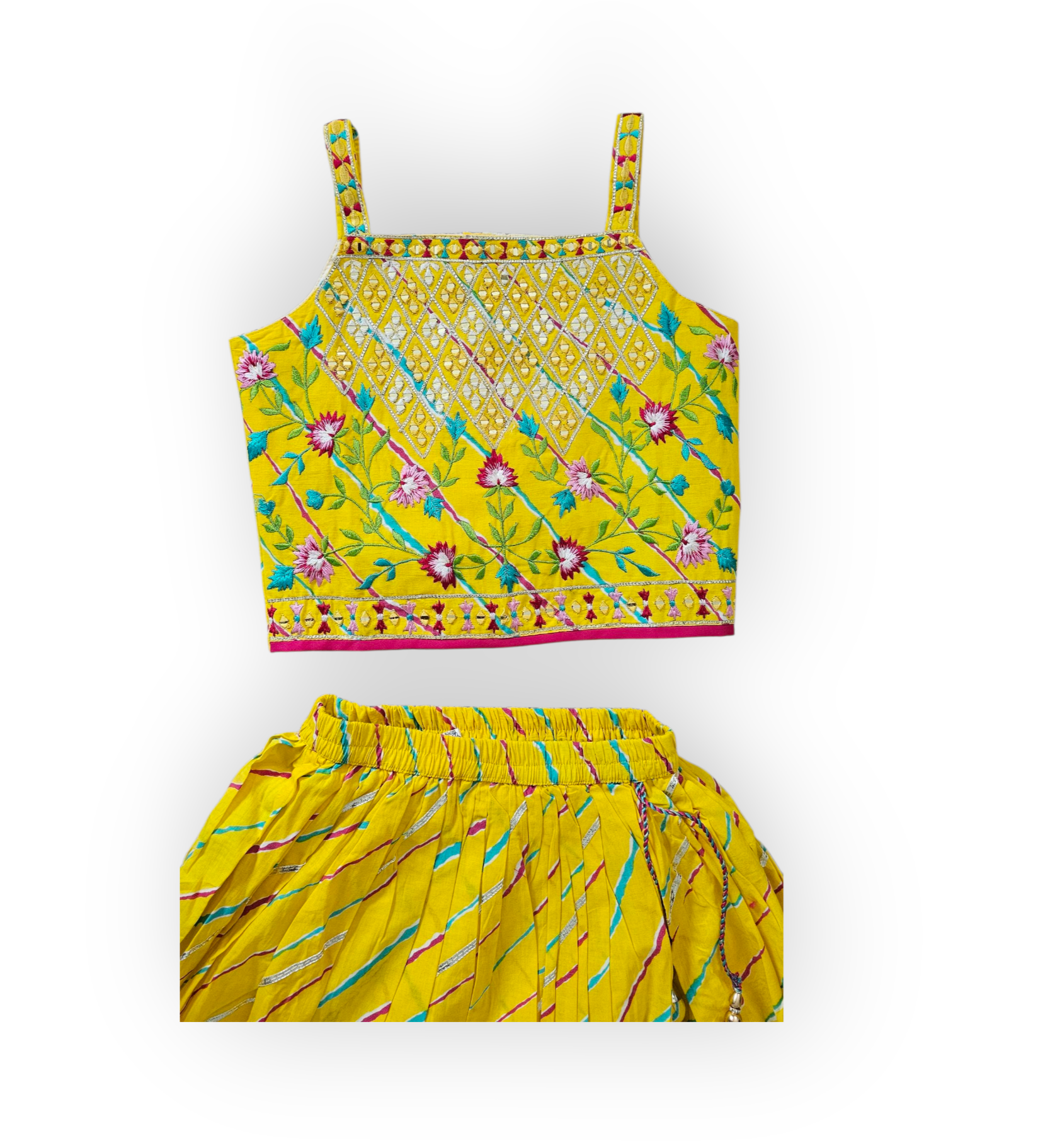 Add a touch of ethnic elegance to your child's wardrobe with this stunning traditional Indian Lehenga choli. 100% cotton, great for the summer, this handcrafted outfit features a beautifully embroidered bodice with intricate geometric patterns, reflecting the rich craftsmanship of Gujarat and Rajasthan.